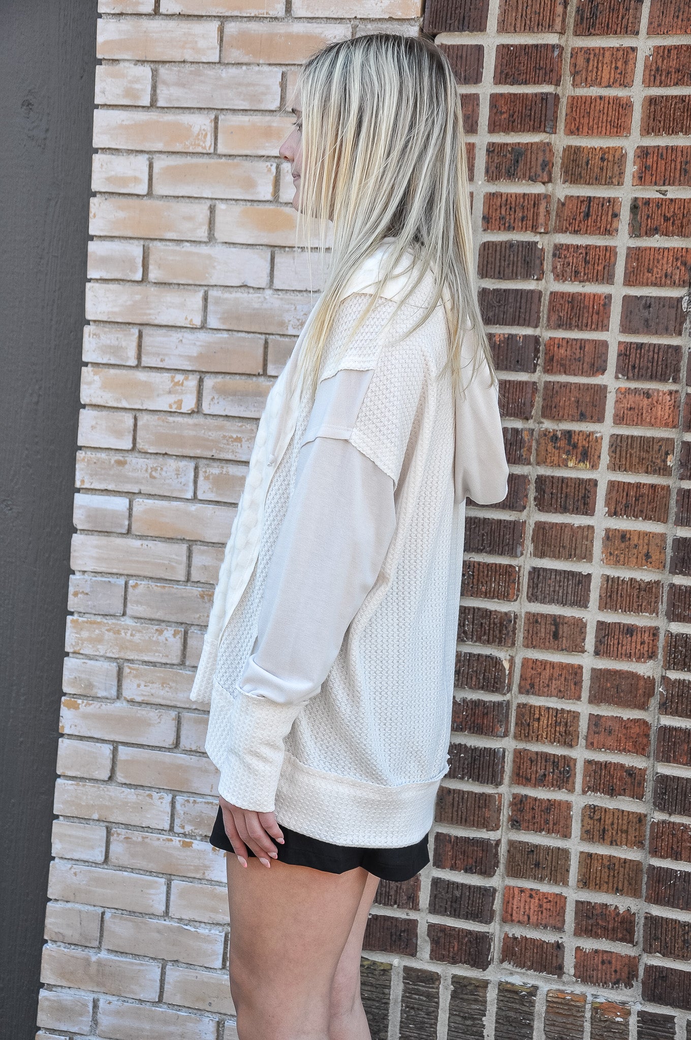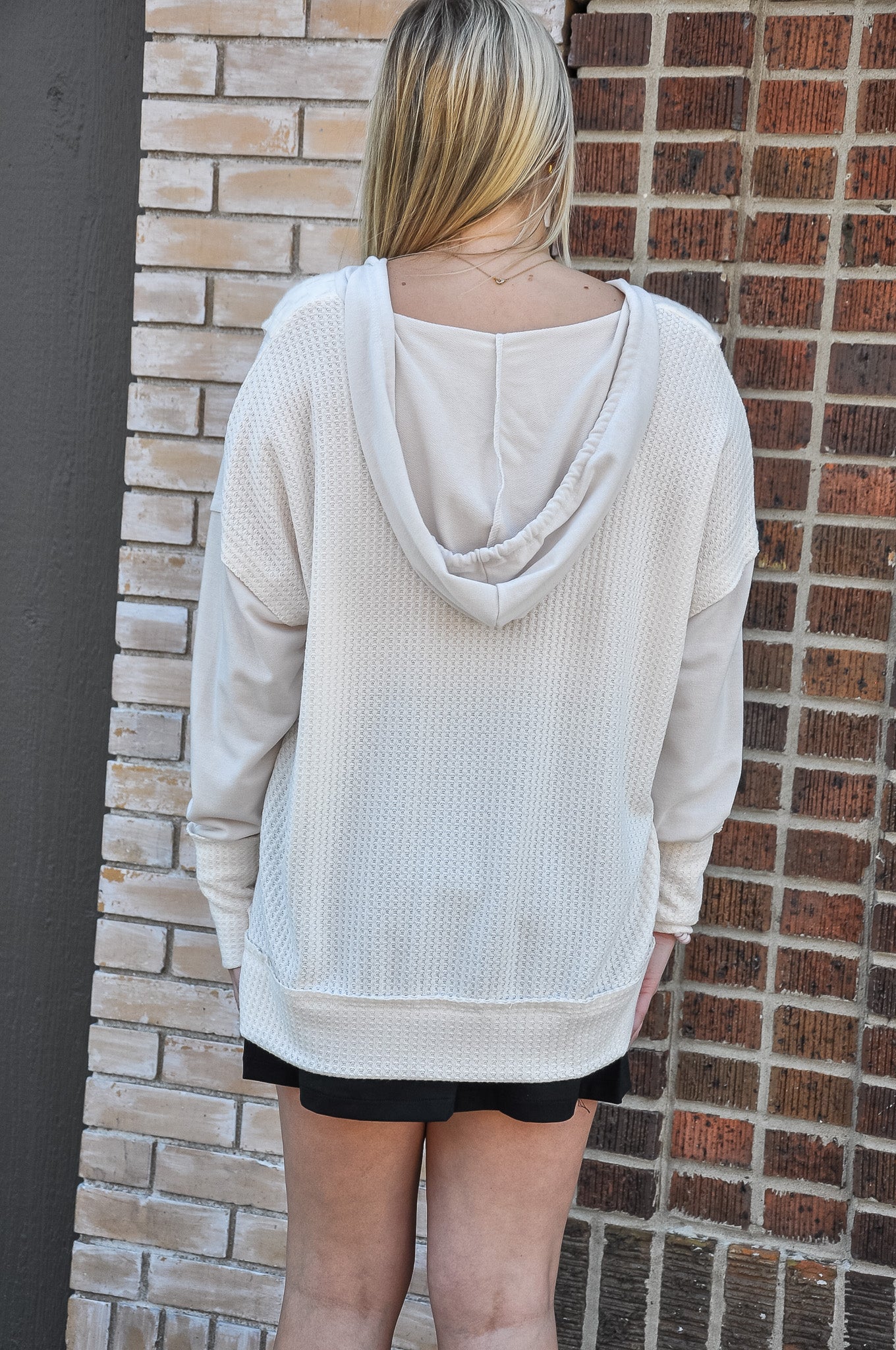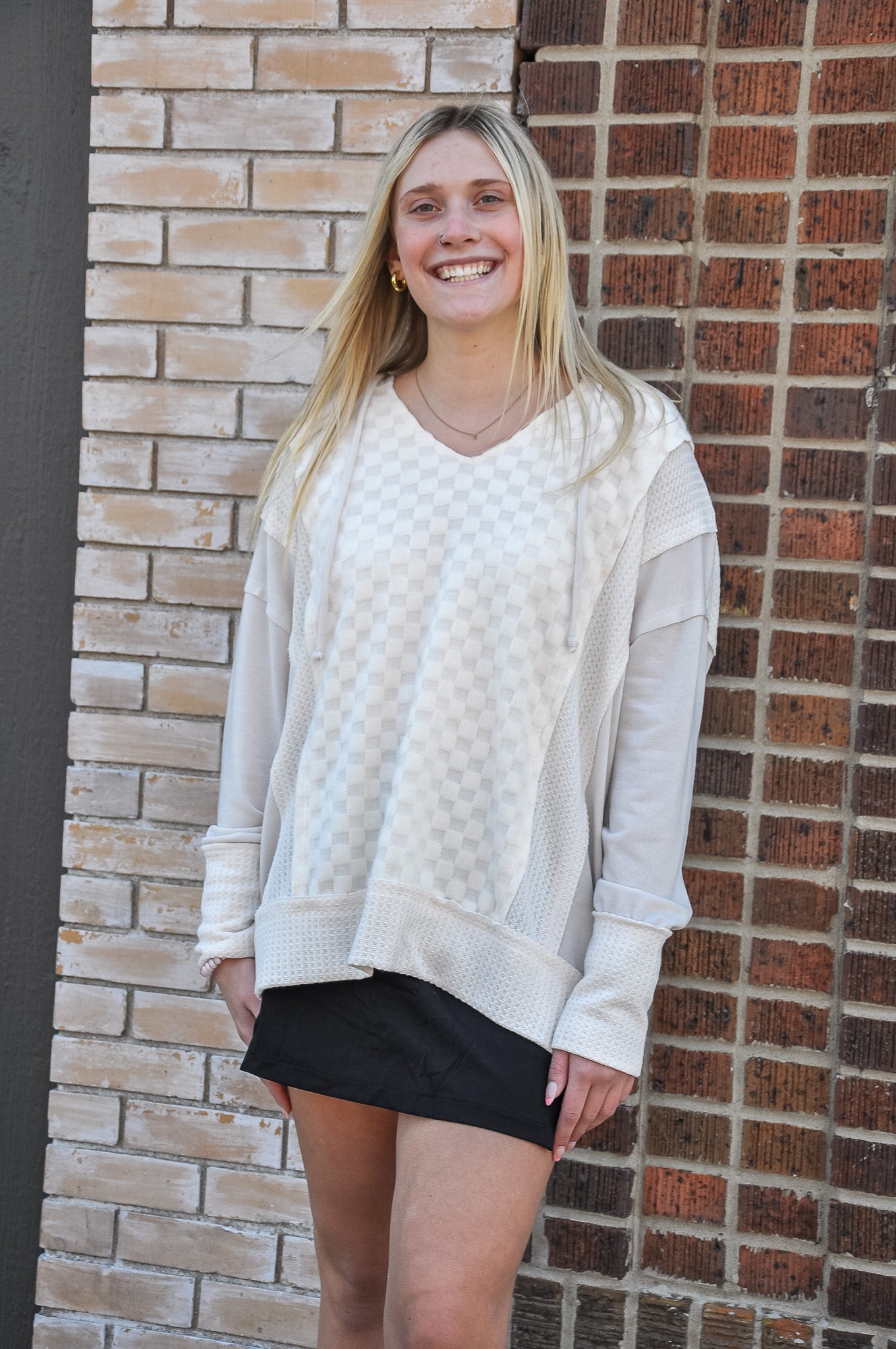 Introducing our Brushed Checker Waffle Hoodie, where comfort meets style in the most delightful way. Crafted with a unique brushed checkerboard pattern and featuring a waffle block cut edge detail, this hoodie stands out from the crowd. The oversized hood adds an extra layer of coziness, perfect for chilly days or lounging at home. Whether you’re running errands or relaxing with friends, this hoodie offers a versatile and effortlessly chic option for any occasion. Pair it with your favorite jeans for a casual look or layer it over leggings for a relaxed vibe. Embrace comfort and style with our Brushed Checker Waffle Hoodie and elevate your wardrobe with this must-have staple.